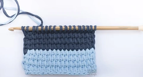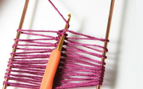 Com uma agulha longa, semelhante à de tricô, essa técnica permite manter vários pontos na agulha e resulta em um tecido denso, macio e uniforme — excelente para roupas de frio e mantas.