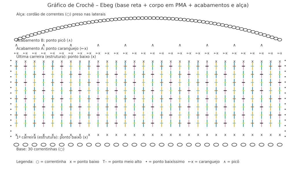O tamanho da sua ebeg de crochê vai depender da sua função. Para uso como bolsinha, capa ou organizador, um tamanho médio (cerca de 25 cm de altura por 30 cm de largura) é ideal. Use a fita métrica para medir durante a confecção.